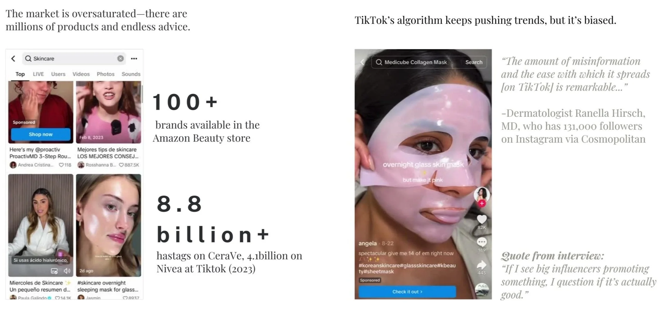 To inform the product strategy and design direction, a multi-method research approach was conducted to better understand user behavior, market gaps, and the emotional landscape surrounding skincare decision-making. The research aimed to uncover how users navigate product selection, what builds trust, and where current solutions fall short.
